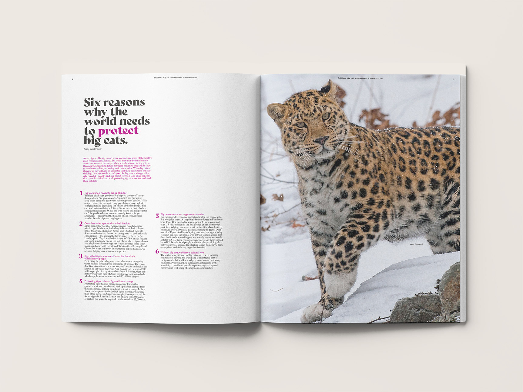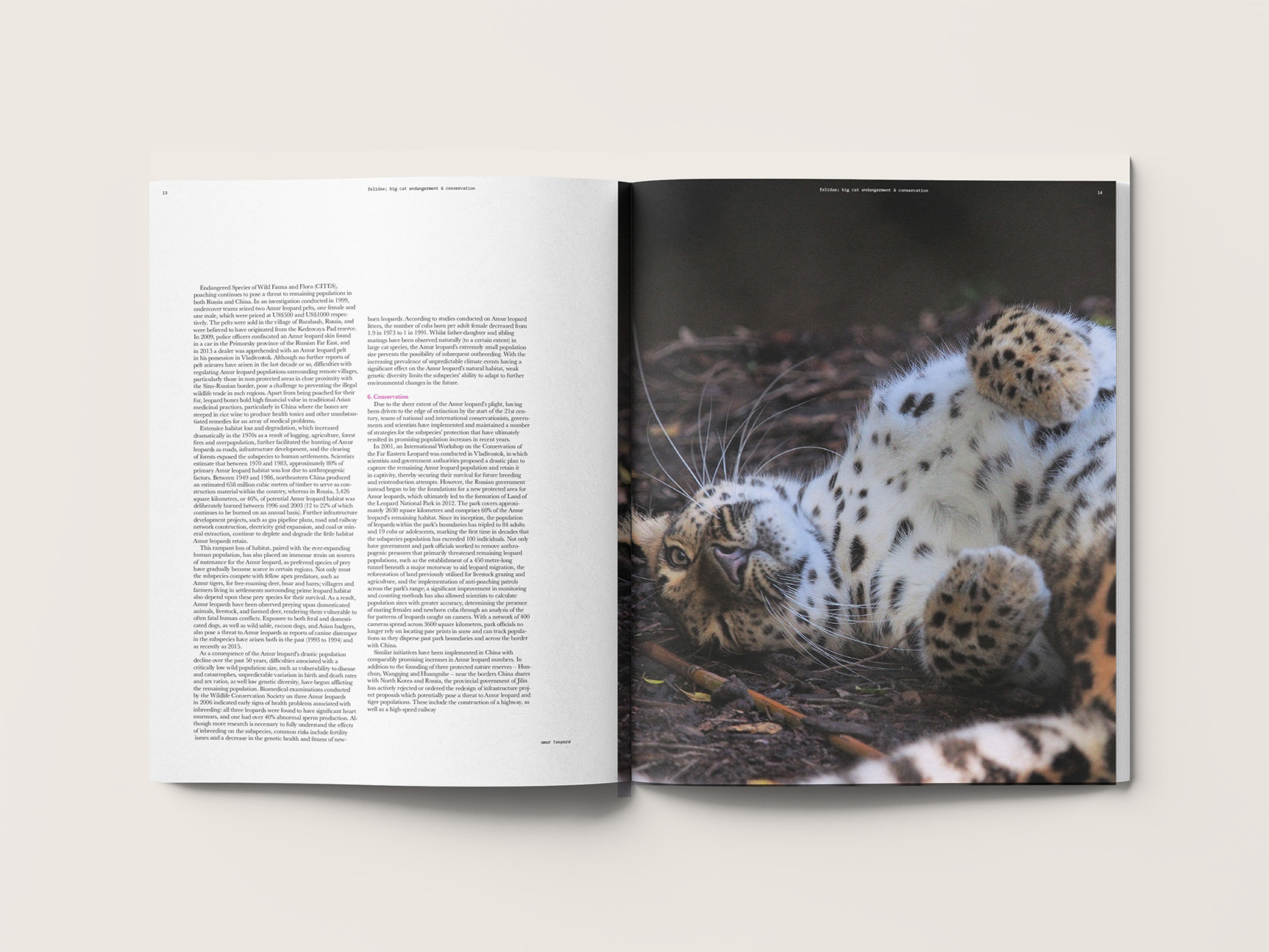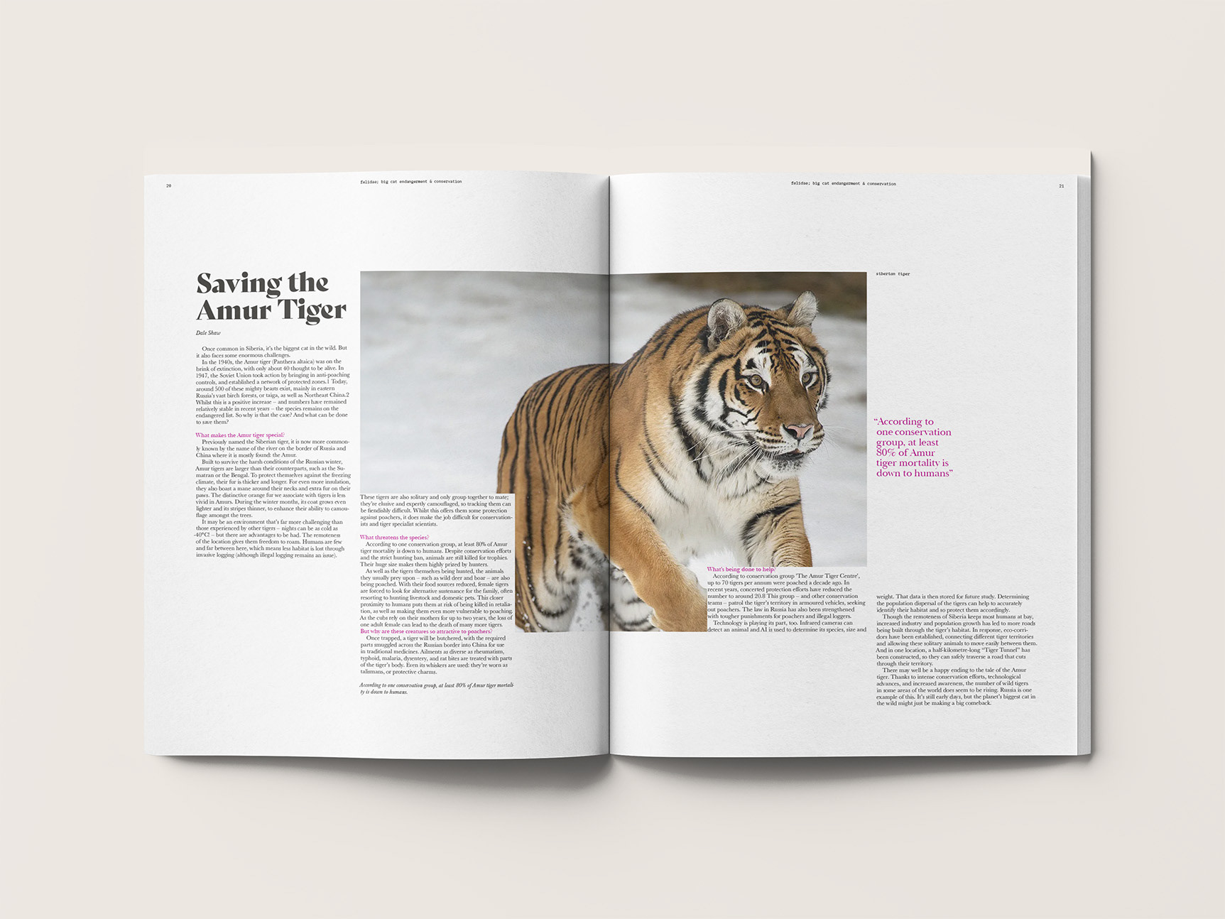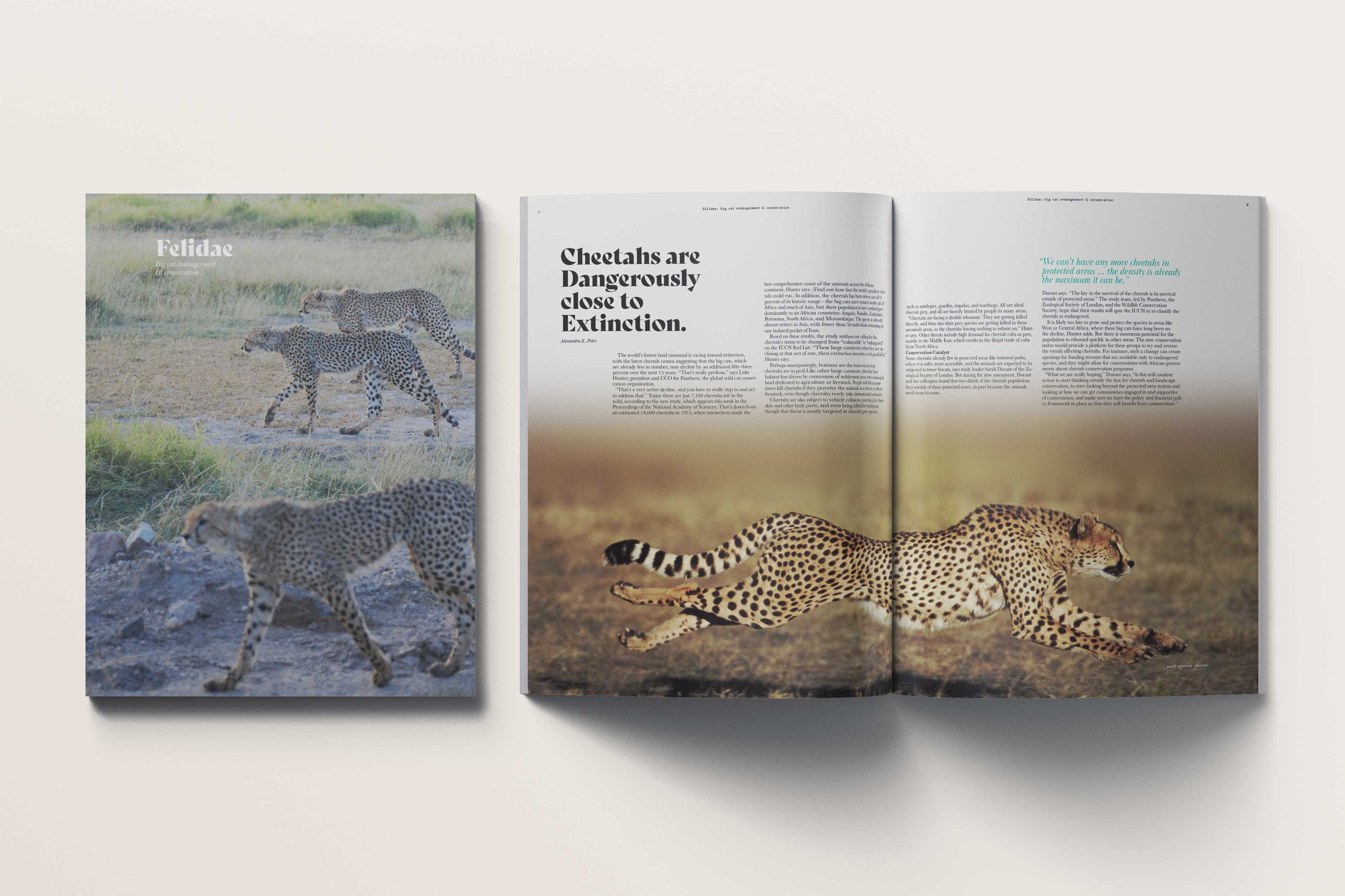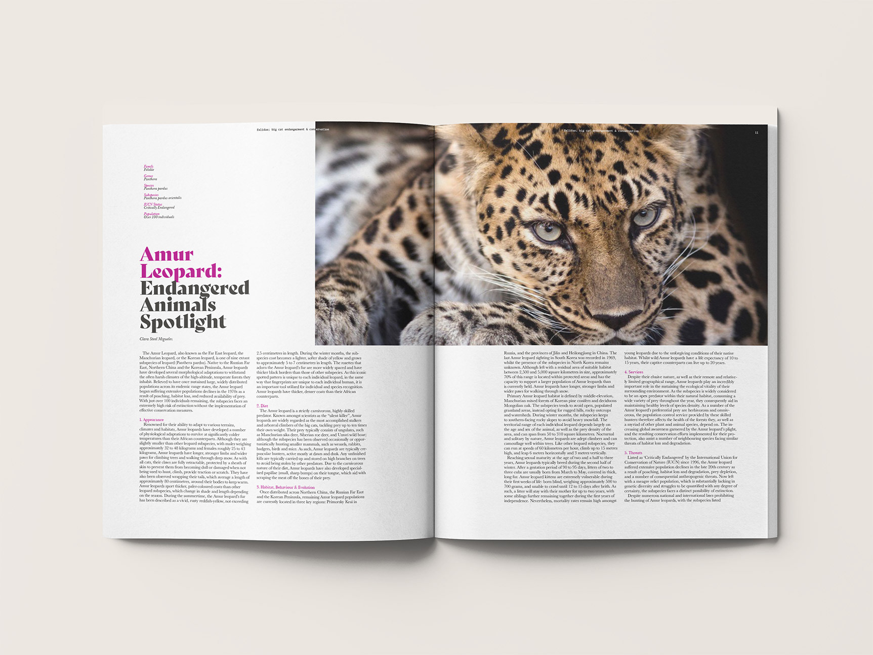 Felidae is a magazine concerning the endangerment and conservation of big cats. This topic is something I care deeply about, and I wanted the magazine to reflect both the urgency and hope found with wildlife conservation efforts. The first couple of spreads in the magazine go over some of the endangered big cats, peaking at the Amur Leopard, who is nearly extinct. After that, the magazine takes a lighter tone, beginning to cover animals who have recovered from endangerment through conservation efforts.