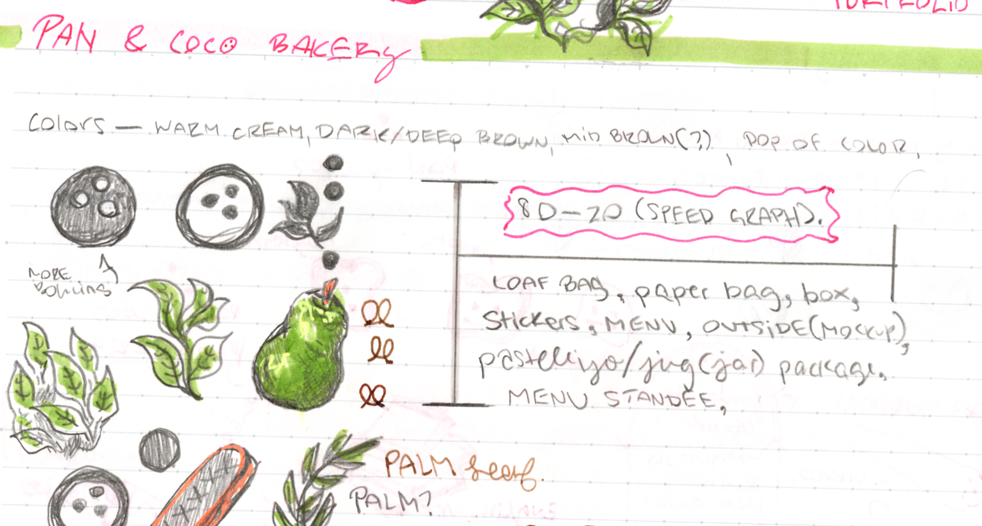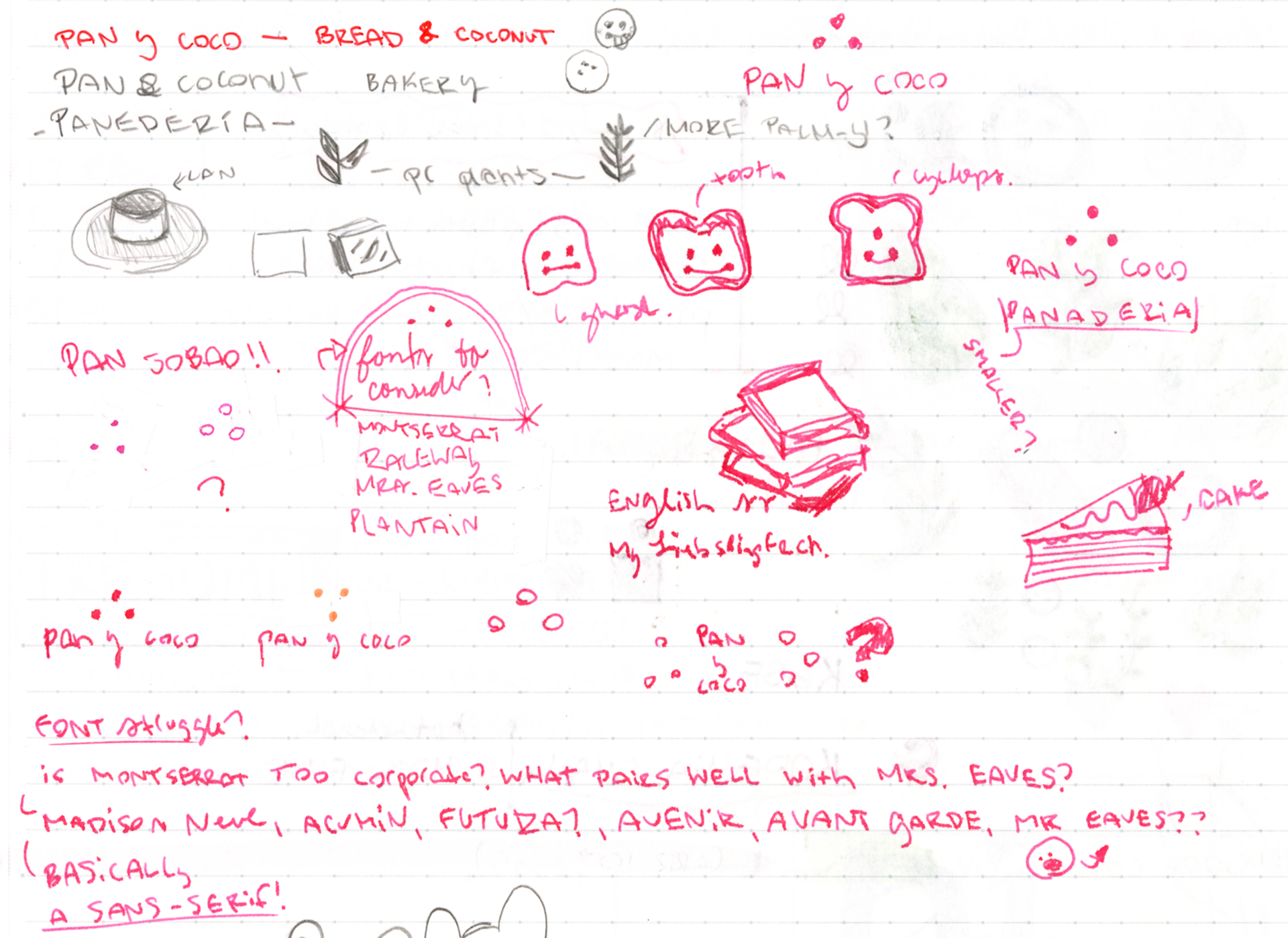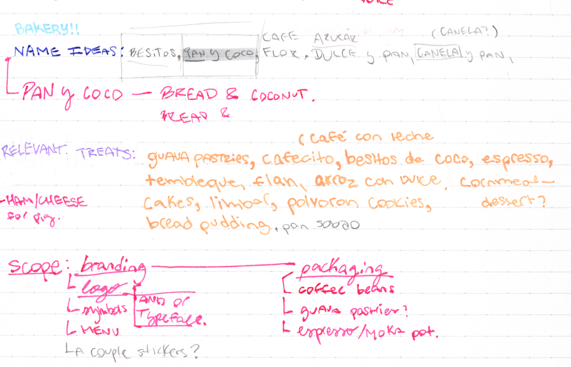 Below are some of the original sketches from this concept. I started this project by creating a list of my favorite Puerto Rican sweets. You can see my initial name ideations as well as deciding the scope of the project. I also tried a couple of different logos out, but eventually decided on the coconut as the main logo mark.