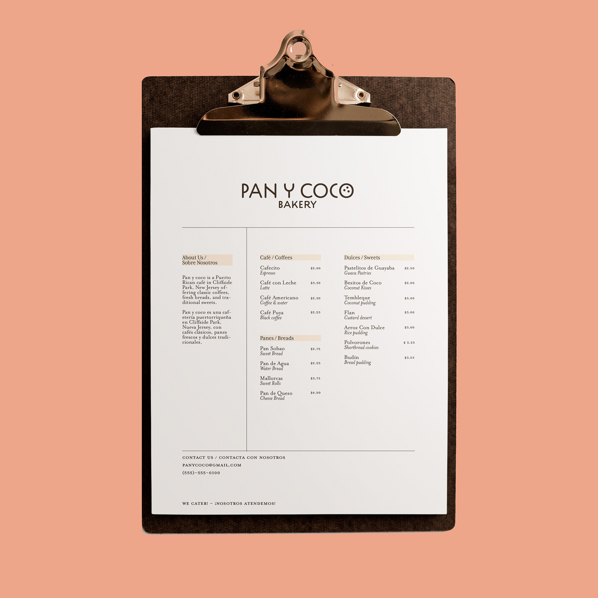 PAN Y COCO is a branding project concerning a Puerto Rican bakery. This is more of a passion project as it gives me an opportunity to reference my culture's treats. Pan y coco translates to bread and coconut, which are staples in Puerto Rican cuisine. The oblong shapes next to the coconuts are a simple way of representing bread. I originally designed something more detailed, but shifting to this approach gave me much more room to play with the visuals.